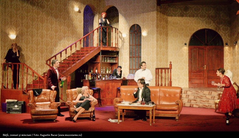 Ce m-a cucerit cel mai mult la Bârfe, zvonuri și minciuni? Greu de spus. Pentru că întreg spectacolul – care promite „o acțiune construită în stilul filmelor polițiste, dar în ritm de comedie” – este absolut perfect. Charlie, viceprimarul orașului New York ar trebui să serbeze zece ani de căsnicie cu soția sa Myra, alături de câțiva dintre prietenii lor bogați și influenți. Doar că Charlie zace la etaj, împușcat în ureche și confuz, Myra e de negăsit, iar servitorii au dispărut și ei. Și invitații sosesc pe rând. Iar de aici începe nebunia. Nimeni nu știe dacă a fost o tentativă de crimă sau dacă Charlie a vrut să se sinucidă. Îngroziți de ce s-ar întâmpla cu reputația lor dacă s-ar afla că au fost implicați într-un astfel de incident, toți cei prezenți la petrecere încearcă să mușamalizeze totul, cel puțin până descoperă singuri adevărul. Iar „investigația” lor, perturbată constant de încercările de a se induce în eroare unul pe celălalt, face deliciul publicului timp de 2 ore și jumătate.