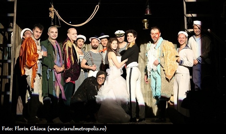 În primul rând, dacă v-ați aruncat un ochi pe distribuție, v-ați prins probabil de ce voiam eu să văd neapărat Furtuna deși știam prea bine că nu-i tocmai o montare clasică. Două nume. Doi actori care sunt mereu impecabili pe scenă, indiferent de personajele pe care le au de adus în fața publicului. Ioan Andrei Ionescu și Gavril Pătru. Doi oameni înzestrați cu un talent ieșit din comun care nu se dezmint nici de această dată și care ne reamintesc tuturor că aplauzele chiar nu sunt suficiente pentru a-i răsplăti la final de spectacol. Rolurile le vin ca turnate. La fel și costumele asortate viclean cu ochii… Și e o bucurie să-i privești jucând. Sau poate ar trebui să spun jucându-se? Let’s say both, for the sake of it… Și dacă tot suntem la capitolul distribuție, să nu uităm de Miranda cea miraculos creionată de către Alexandra Sălceanu. Ori de gașca de marinari/creaturi ale insulei care duce mare parte din greul spectacolului și fără de care Furtuna nu cred că ar mai fi la fel. Ei aleargă dintr-o parte într-alta, se schimbă, dansează, țopăie, și mai fac și ceva actorie între timp. Motiv pentru care vreau să-i felicit aici, de față cu toată lumea, înainte să vă spun și despre Caliban-ul lui Mihai Călin. Unii ar spune că poate cel mai complicat rol din piesa lui Shakespeare. Și se prea poate să fie așa. Un personaj construit cu multă energie și inspirație, pe care publicul are de ce să-l iubească. Un rol ofertant de care ar fi fost și păcat să nu profite la maxim!