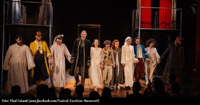 E o bucurie să mergi la teatru și să te răsfeți cu povești care păreau de mult uitate. Și costume din alte vremuri. Și culoare, și muzică, și magie. E o bucurie să vezi cu câtă bucurie urcă oamenii ăștia pe scenă! Fiindcă nu, Arlecchino și pierdutele iubiri nu e unul dintre spectacolele prea ușor de jucat. Dar e jucat bine. Și aplauzele furtunoase de la final de spectacol au confirmat asta! Toți sunt buni și toți își creionează personajele cu mult aplomb. Și nu vorbim de personaje cărora le poți da viață cu una, cu două… Și trebuie să vă spun că Aida Avieriței e superbă în rolul lui Arlecchino. Are fix energia care trebuie, are dezinvoltură și stăpânește fără pic de ezitare partitura asta care cere un soi aparte de talent: cel pentru comedie. Mulțumesc Aida pentru tot ce-ai făcut tu pe scenă! 🙂 Și mai e cineva care mi-a atras – din nou! – atenția în spectacolul ăsta. Da, probabil că dacă v-ați aruncat deja un ochi pe distribuție ați ghicit că e vorba de Radu Micu. Același Radu Micu care m-a cucerit în Iluzia Comică. Și care regret nespus că n-a jucat în cele două seri de Vlaicu Vodă în care am fost și eu în Piața Constituției, fiindcă așa cum vă spuneam și atunci la finalul poveștii despre nebunia aia frumoasă pusă la cale tot de Excelsior (poveste pe care o găsiți aici) pun pariu că a făcut un rol genial. La fel cum s-a întâmplat miercuri seară în Arlecchino și pierdutele iubiri unde a demonstrat încă o dată că-i unul dintre cei mai buni. Se face ușor iubit de public, căci are o lejeritate aparte în joc. Își iubește meseria și asta se vede cu ochiul liber. Și între noi fie vorba, nu cred că-i la îndemâna oricui să-l personifice pe Orazio așa cum se cuvine. Pentru că e unul dintre acele roluri pentru care e imperios necesar să știi cum să jonglezi cu umorul astfel încât totul să rămână mereu în echilbru. Nu, Commedia dell’Arte nu-i pentru oricine. Așa cum ziceam, e ușor să-ți pierzi echilibrul și să te îndrepți spre ridicol ori spre superficial, iar asta poate face ca magia poveștii să se destrame… Dar nu-i cazul aici, căci Radu domină cu dibăcie scena în spectacolul ăsta și asta e mare lucru!