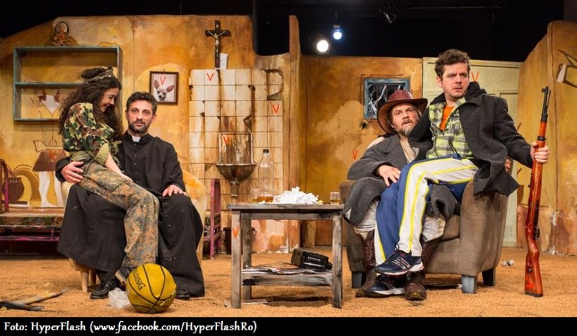 Și aminteam despre băieții din distribuție… Dar o să încep cu fata. Pentru că Ioana Calotă mi s-a părut superbă. Nu-i ușor să fii singura gagică din Vestul singuratic. Dar fata asta transmite enorm. Și e imposibil să n-o iubești pe Girleen a ei. Mulțumesc pentru că m-ai făcut să plâng, Ioana! 🙂 Now, back to the boys… Trei Doamne, și toți trei absolut minunați! Vlad Zamfirescu și Florin Piersic Jr. sunt incredibil de credibili în rolurile fraților duși cu capul pe care publicul îi adoră pe bună dreptate. Nu e ușor ce fac ei acolo. Absolut deloc. Doar că ei nu lasă nicio secundă să se vadă asta. La fel cum nici Andi Vasluianu – pe care, vă spun sincer, nu mi-l prea imaginam în chip de preot – nu lasă publicul să întrezărească niciun pic din tot efortul pe care-l cere o asemenea partitură. Și are omul ăsta un monolog înainte de pauză… Ei bine, e genial momentul…